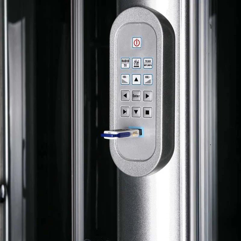 Stay entertained while you relax with the integrated 8.4" Waterproof LCD TV. The system also features Bluetooth connectivity and an FM radio, allowing you to stream your favorite music or audiobooks through high-quality speakers. All functions—including steam, temperature, lighting, and media—are easily managed via the sleek Touchscreen Control Panel or the included water-resistant remote.