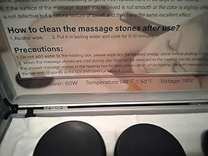 Use the provided heating box to warm stones to about 158°F, ensuring even heat distribution for safe use.