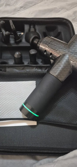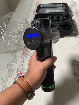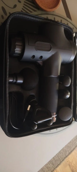 The percussion massager is easy to use and comes with several interchangeable heads for different purposes. Begin on the lowest intensity setting and gradually increase based on comfort. Apply it to sore or tight muscles for short periods (1–3 minutes per area) to help relieve tension and support muscle recovery. Always move the massager slowly and avoid sensitive or bony areas.